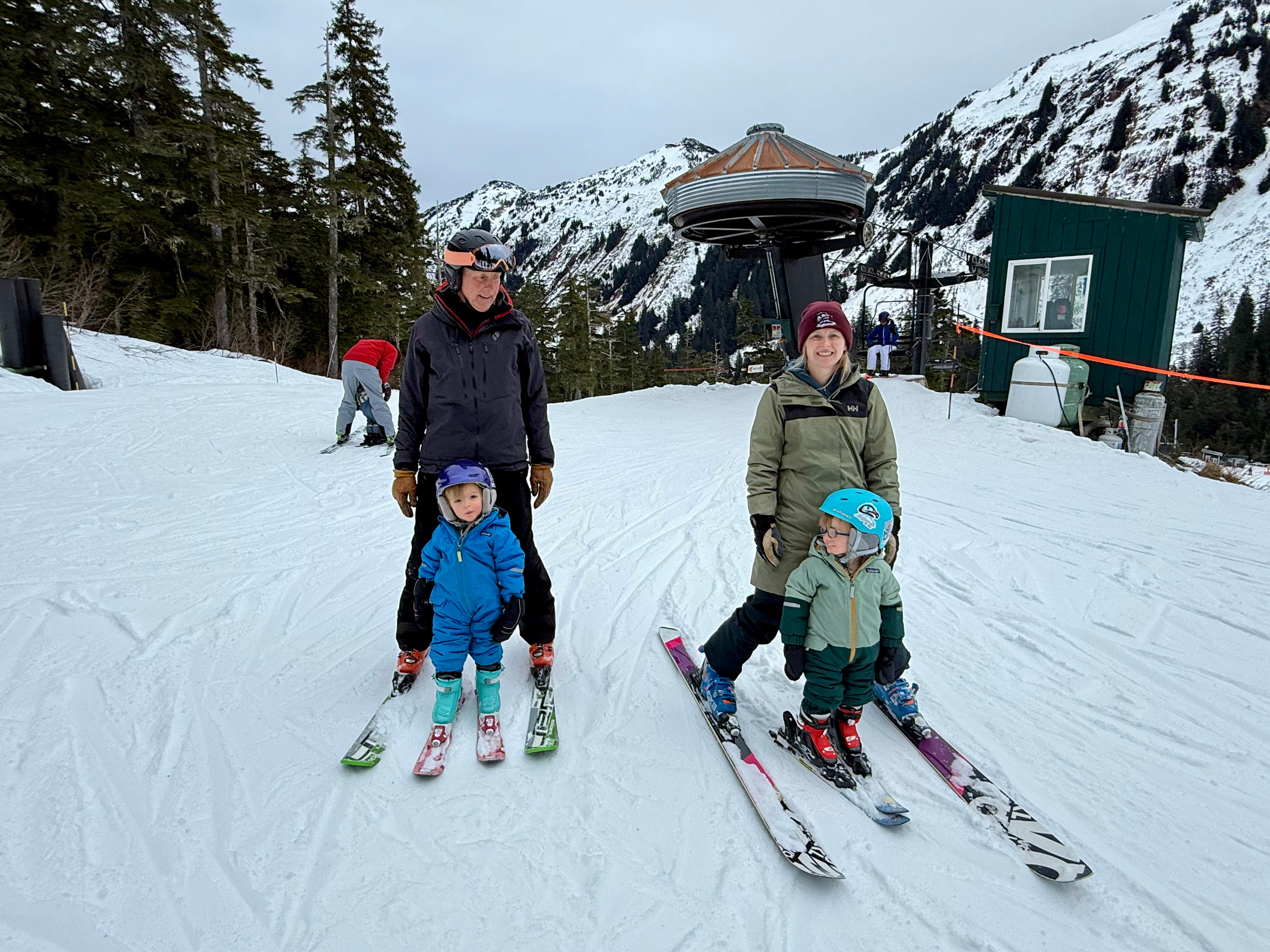 My dad raced with ski clubs in Colorado in his post-college years. He taught me to ski in the Lake Tahoe area of the Sierra Nevada Mountains. Our kids, four and six, had just learned to ski in California when we moved here.